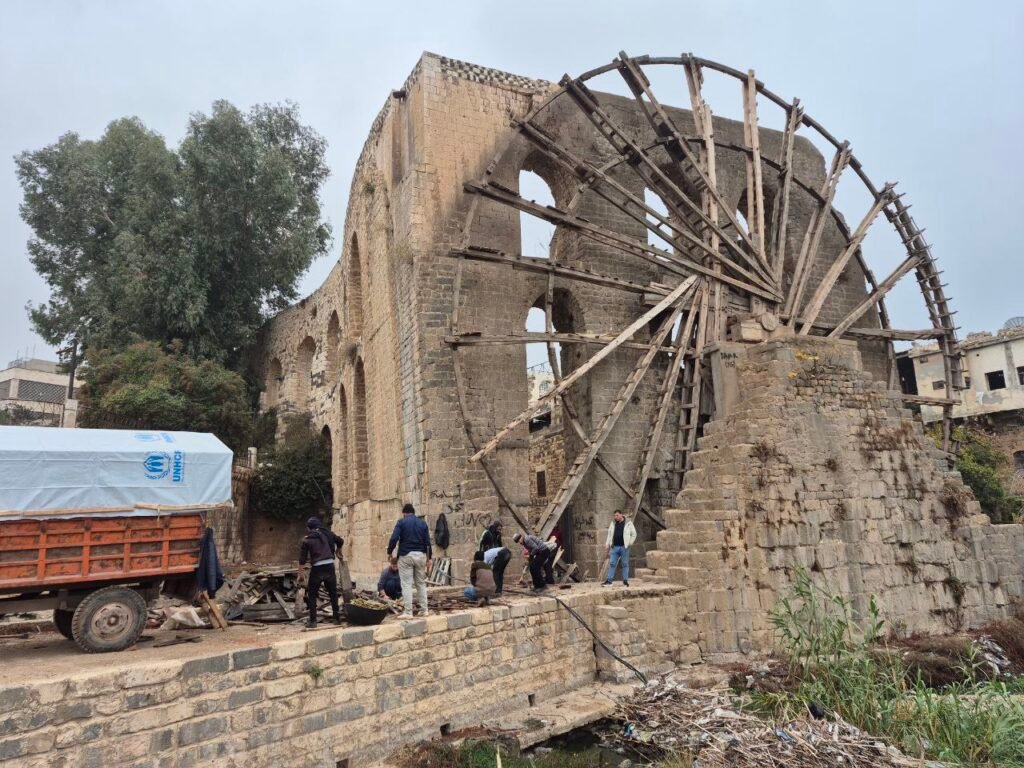 على مقربة من ساحة العاصي، نُقلت ناعورة المأمورية إلى ما يشبه «مستشفى مؤقتاً»: ورشة دائرة النواعير، حيث تُفكّك أجزاؤها الخشبية، وتُعاد صناعتها وتركيبها ضمن دورة صيانة دورية تهدف إلى إنقاذ ما يمكن إنقاذه.