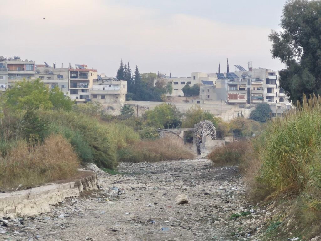 يعبر الناس اليوم مجرى نهر العاصي سيراً على الأقدام. المسافة بين حديقة أم الحسن وناعورة المأمورية صارت طريقاً مكشوفاً، النهر شبه جاف، برك ملوثة متفرقة فقط. الجفاف، وقلة الأمطار، وانخفاض منسوب سد الرستن، عوامل أوقفت المياه عن مجرى النهر، وحصرت استخدامها بالري خارج المدينة.