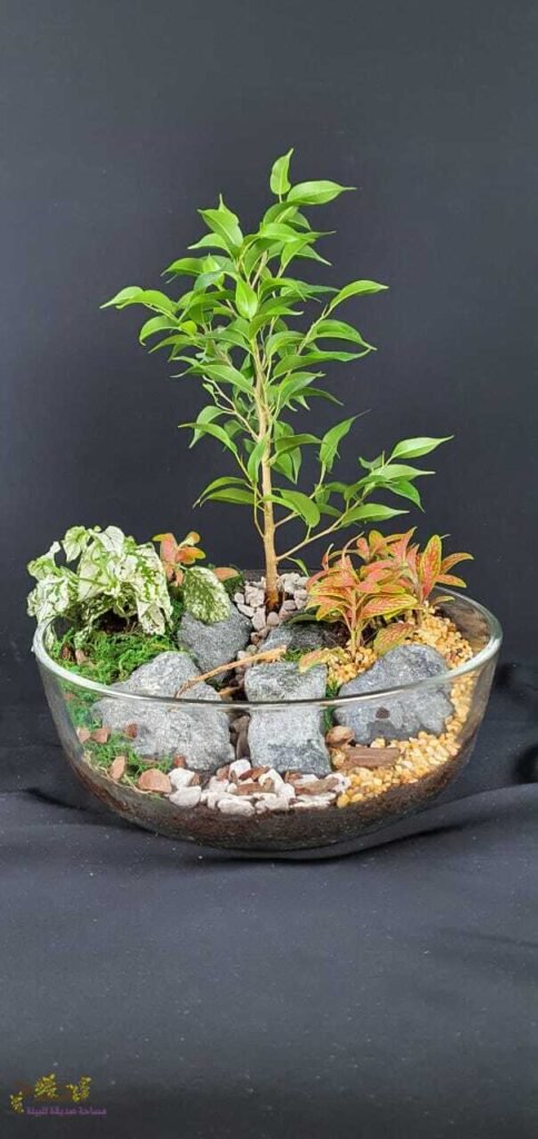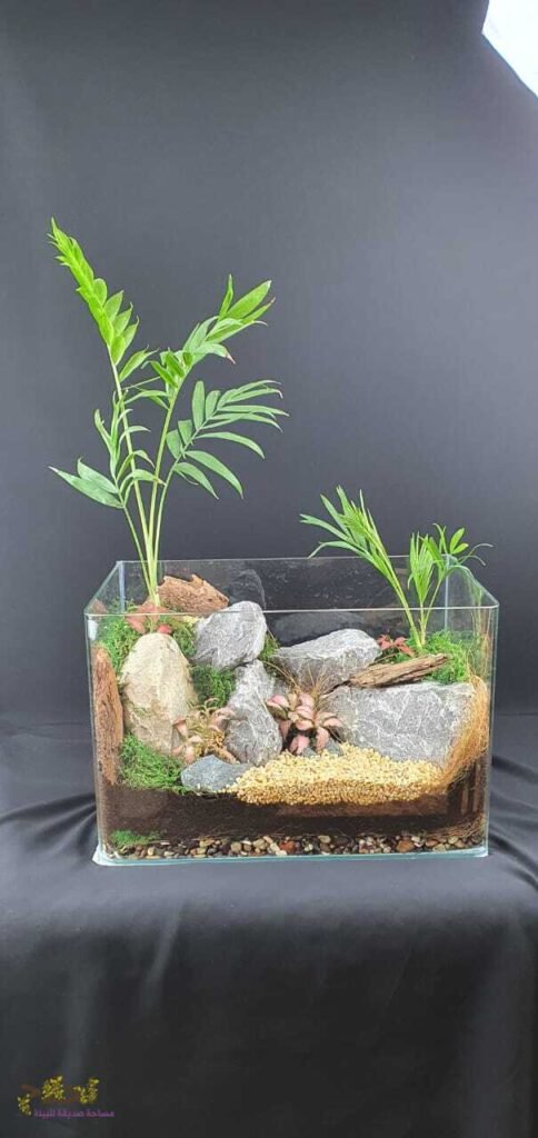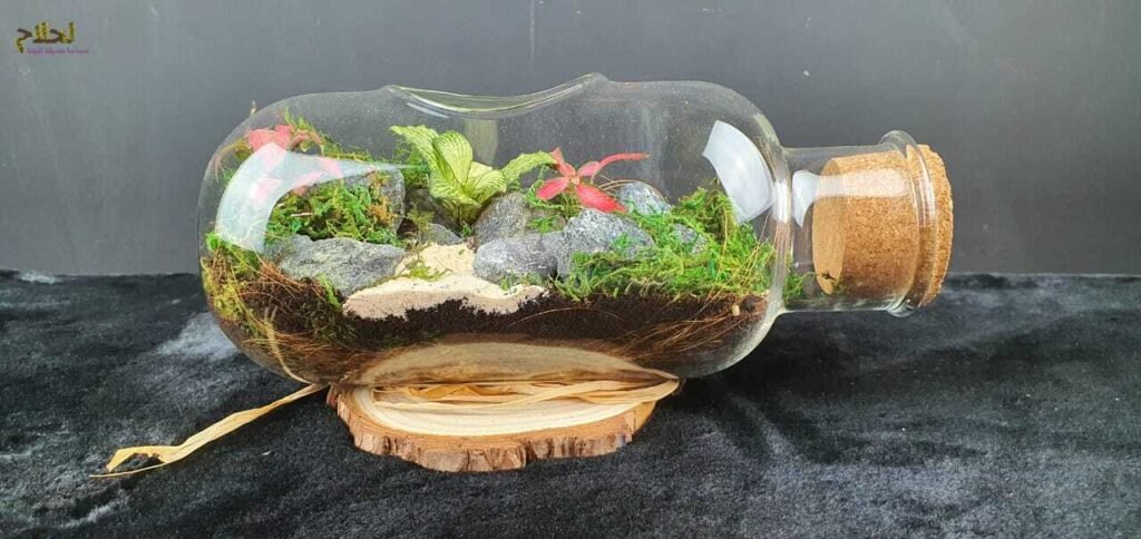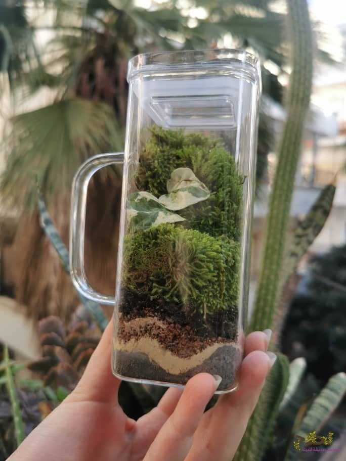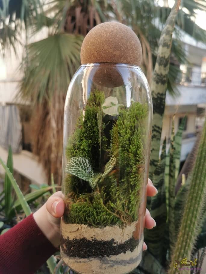 تشير مها إلى النوع الآخر للتيراريوم، وهو النوع المفتوح الذي يختصّ بالصباريات والعصاريات، وتؤكّد على ضرورة عملية التعقيم، “حتى الطحالب لها طريقة يالتعقيم، مع أي إضافات من الطبيعة يجب تعقيمها، وهذا الأمر يعطيها استدامة وعمراً طويلاً”. تصفه مها بأنه “يأكل من عرق جبينه بشكل حرفي”، حيث يتبخّر الماء ويعود ليسقي الأرض داخل الزجاج، وهو من أكثر النباتات استدامة لأنه لا يصرف الماء من جهة، ونظام بيئي يعمل بنفسه خصوصاً عند استخدام الحشرات التي تأكل العفن وتجدد النظام البيئي من جهة أُخرى.